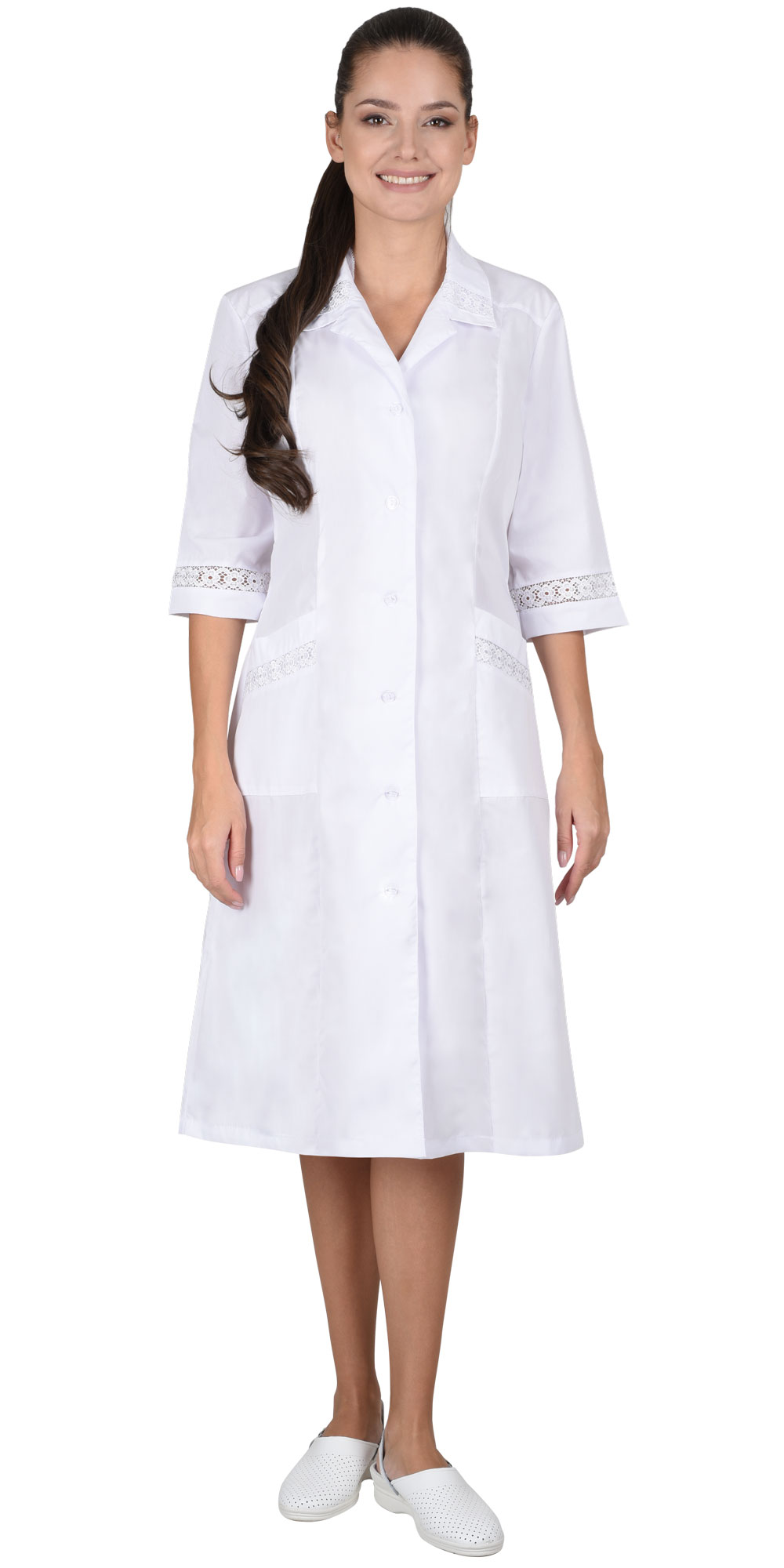 Халат полуприлегающего силуэта, с центральной застёжкой на 5 петель и пуговицы, с отложным воротником, с нижними накладными карманами с фигурными планками. Рукава 3/4. Воротник, карманы, рукава с отделкой кружевом. По талии халат регулируется поясом