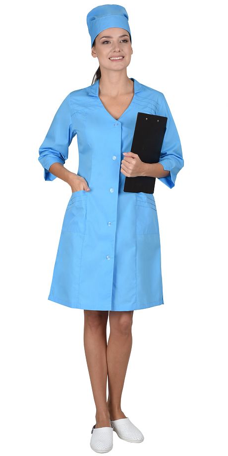 Укороченный халат полуприлегающего силуэта. Особенность модели-декоративные защипы по кокеткам и на карманах. Воротник-стойка. Рукава 3/4 с фигурным разрезом.