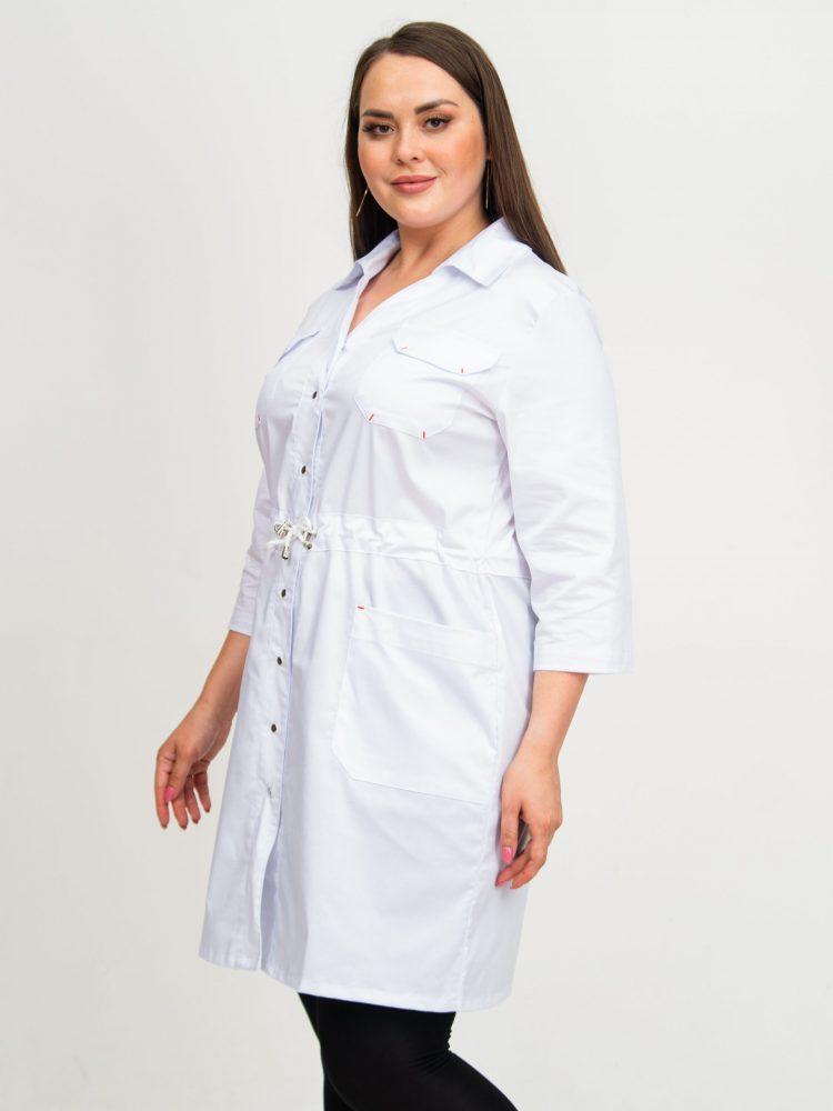 Халат медицинский прямого силуэта на кулиске по талии, с центральной бортовой застежкой на кнопки. с двумя нагрудными накладными карманами с клапанами и с двумя боковыми карманами. Вырез горловины V-образый с отложным воротником. Рукав ¾. Полочка и спинка с притачной кулиской по талии, ширина талии регулируется шнурком.
