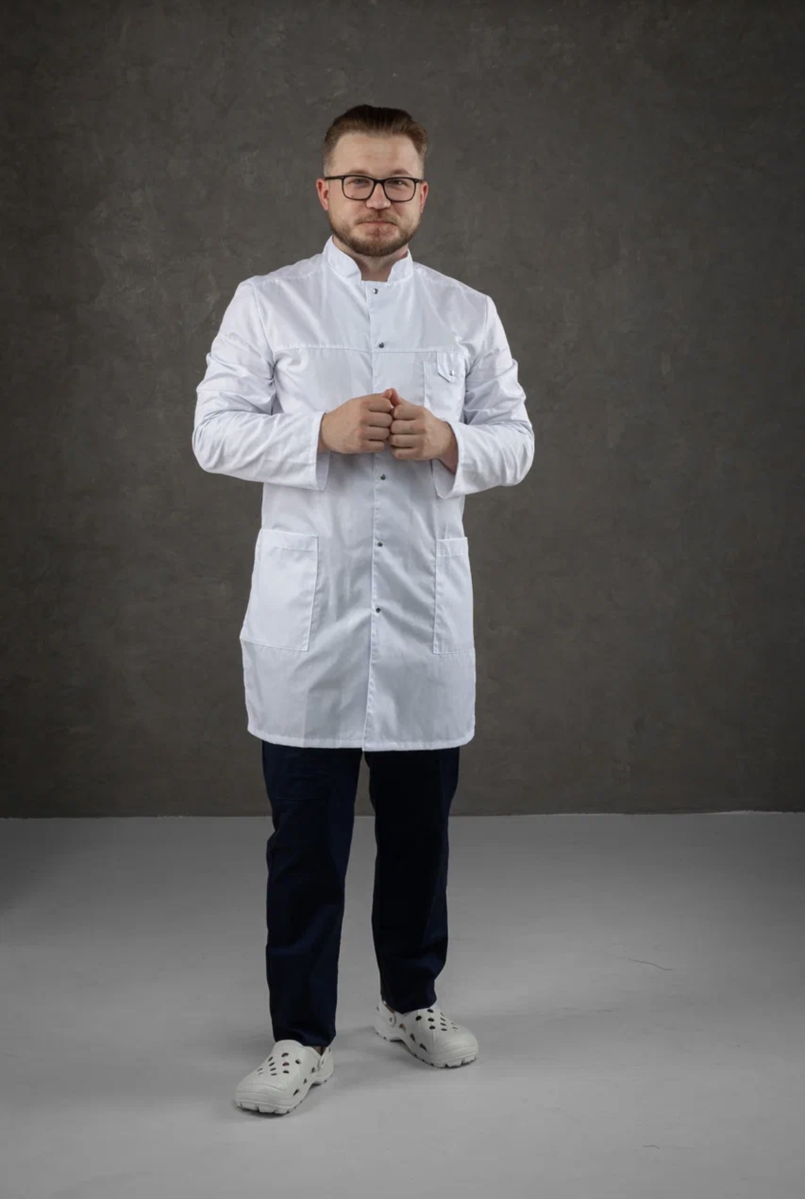 Халат прямого силуэта с центральной бортовой застежкой на кнопки. Воротник стойка. Рукав длинный. Спинка цельнокроеная, с хлястиком. В боковых швах высокие разрезы