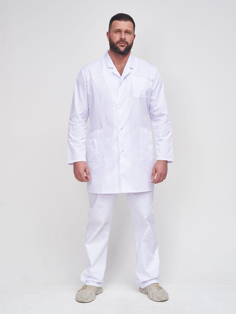 Халат прямого силуэта с центральной бортовой застежкой на кнопках. Полочка с отрезной нагрудной кокеткой, с двумя боковыми и нагрудным карманами. Воротник классический «английский». Рукав длинный трансформер.