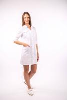 Халат женский полу прилегающего силуэта, с центральной бортовой застежкой на кнопоки, боковыми накладными карманами. Воротник рубачечного типа