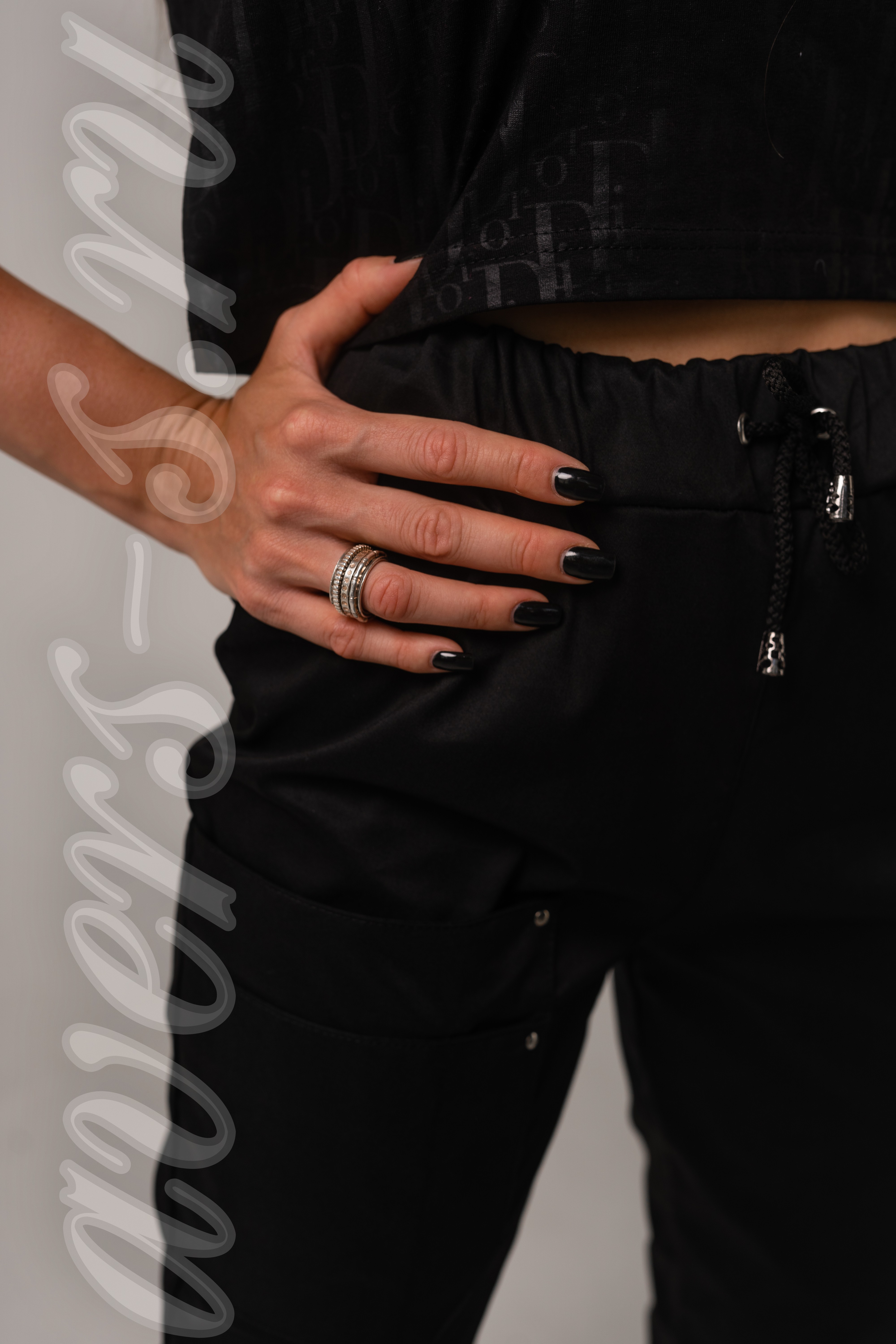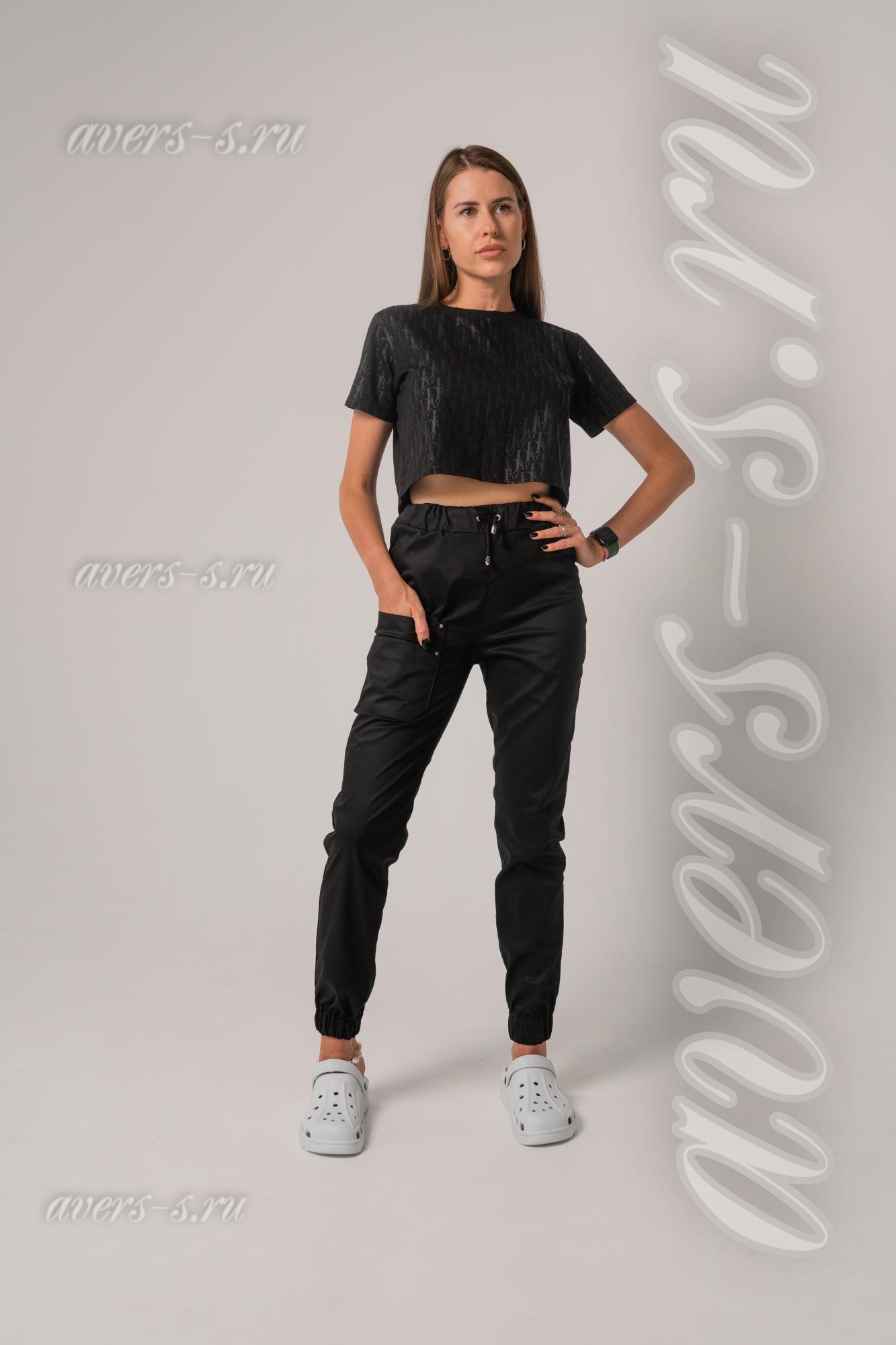 Брюки зауженные, с накладным двойным карманом справа. Низ брюк на широкой резинке. Пояс брюк отрезной на широкой резинке и со шнурком.