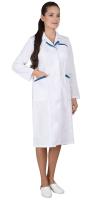 Халат с центральной застежкой на пуговицы. Классическая модель с отложным воротником и длинными рукавами. Ширина по линии талии регулируется хлястиком.