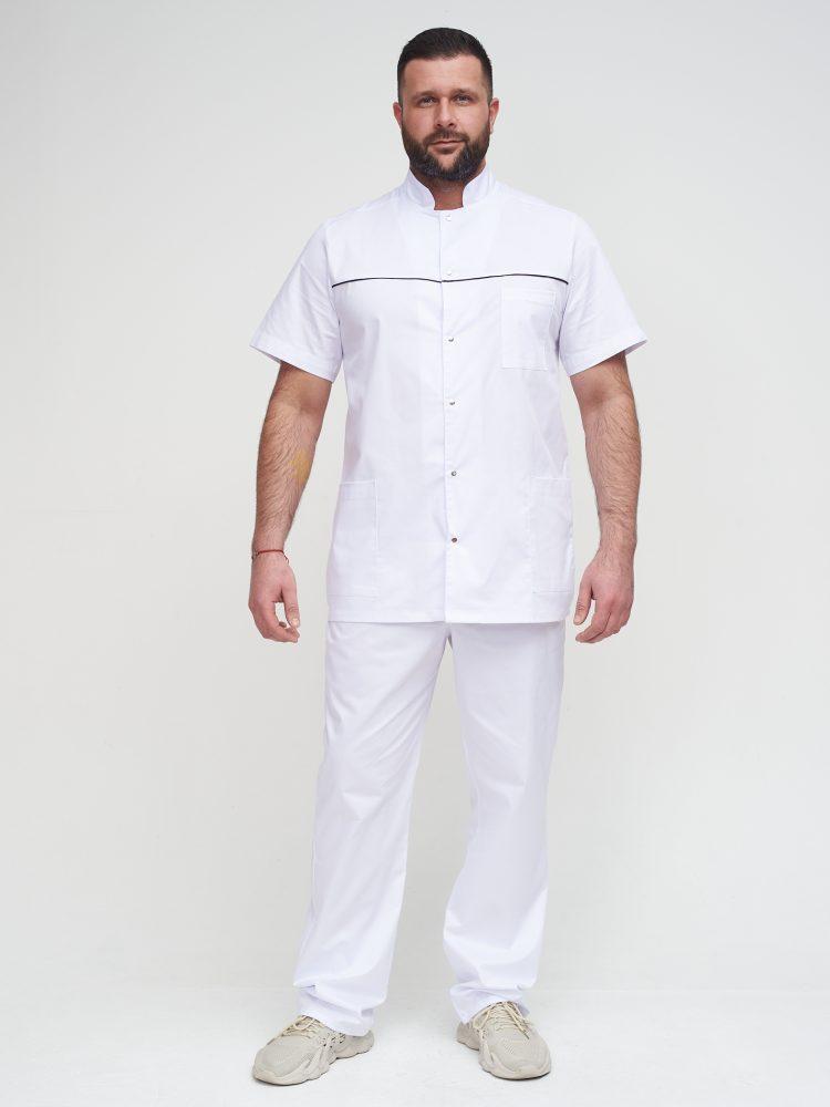 Костюм состоит из куртки и юрюк. Куртка прямого силуэта с центральной бортовой застежкой на кнопки. Полочка с отрезной нагрудной кокеткой, с двумя боковыми и одним нагрудным карманами. Воротник стойка. Рукав короткий. Спинка цельнокроеная. В боковых швах разрезы. Брюки прямые на резинке.