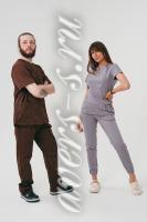 Костюм состоит из куртки и брюк. Куртка прямого силуэта. Вырез горловины V-образный, обработан планками. Рукав короткий. Брюки прямого силуэта с притачным поясом с внутренними боковыми карманами.