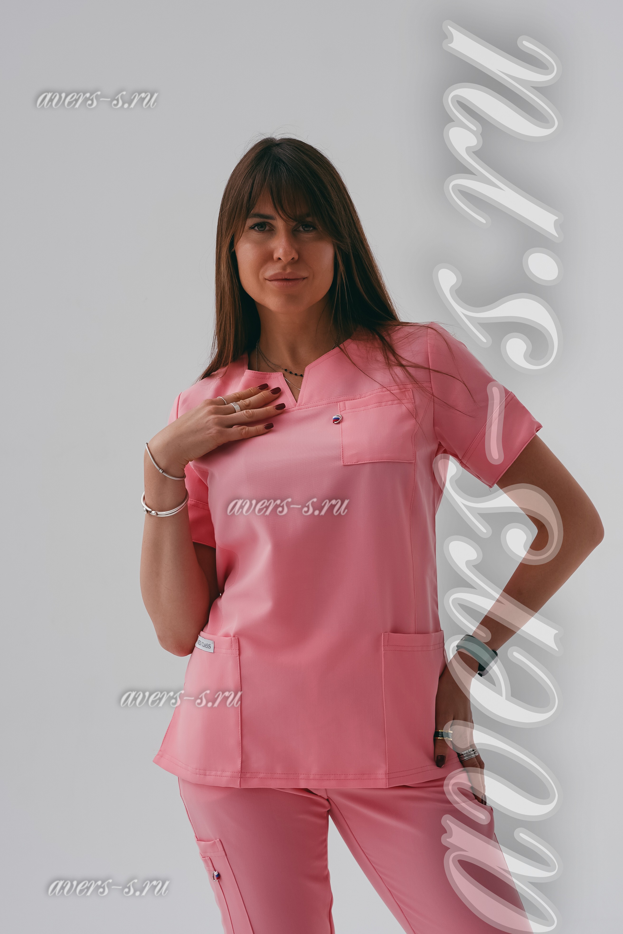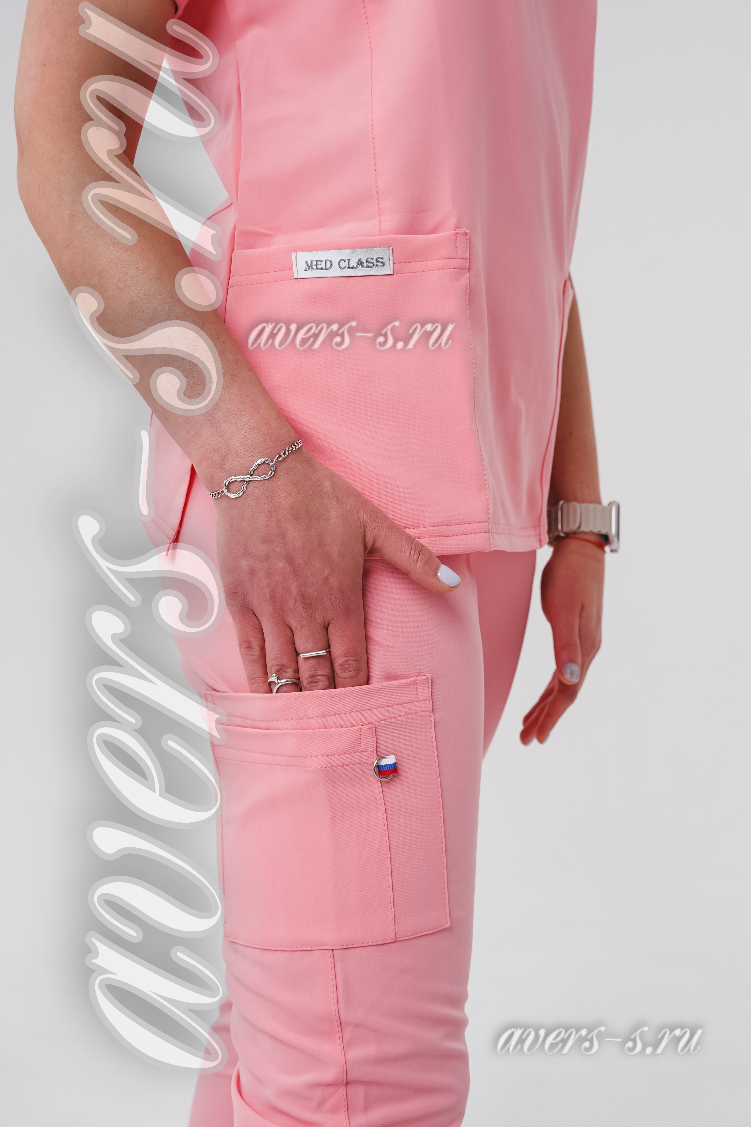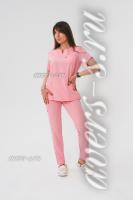 Костюм женский состоит из блузы и брюк. Брюки на эластичной резинке прямого силуэта. Блуза свободная с 3-мя накладными карманами спереди. Рукав короткий.