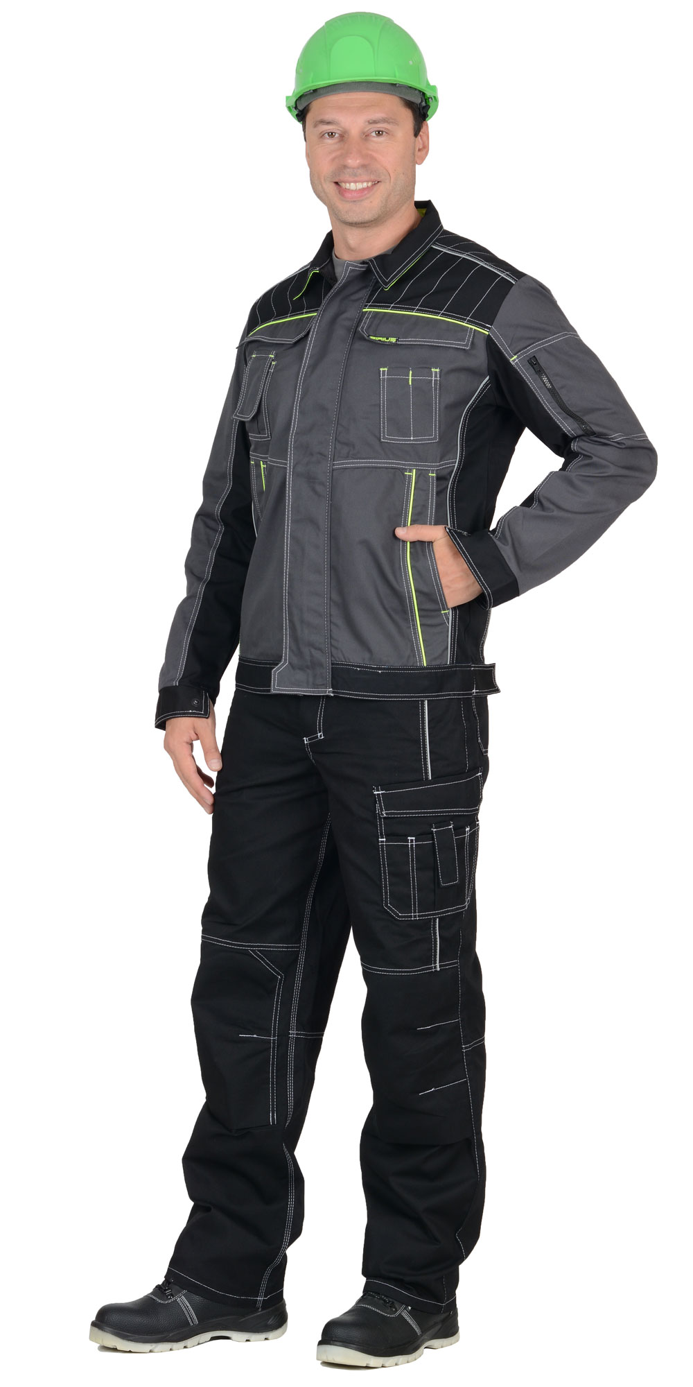 Куртка укороченная, прямого силуэта, с центральной застёжкой на молнию, накрытую ветрозащитной планкой. С отложным воротником, с различными карманами, втачными рукавами и притачными манжетами, на левом рукаве накладной карман с молнией. Куртка с притачным поясом, по спинке пояс регулируется хлястиками застегивающимися на кнопки.