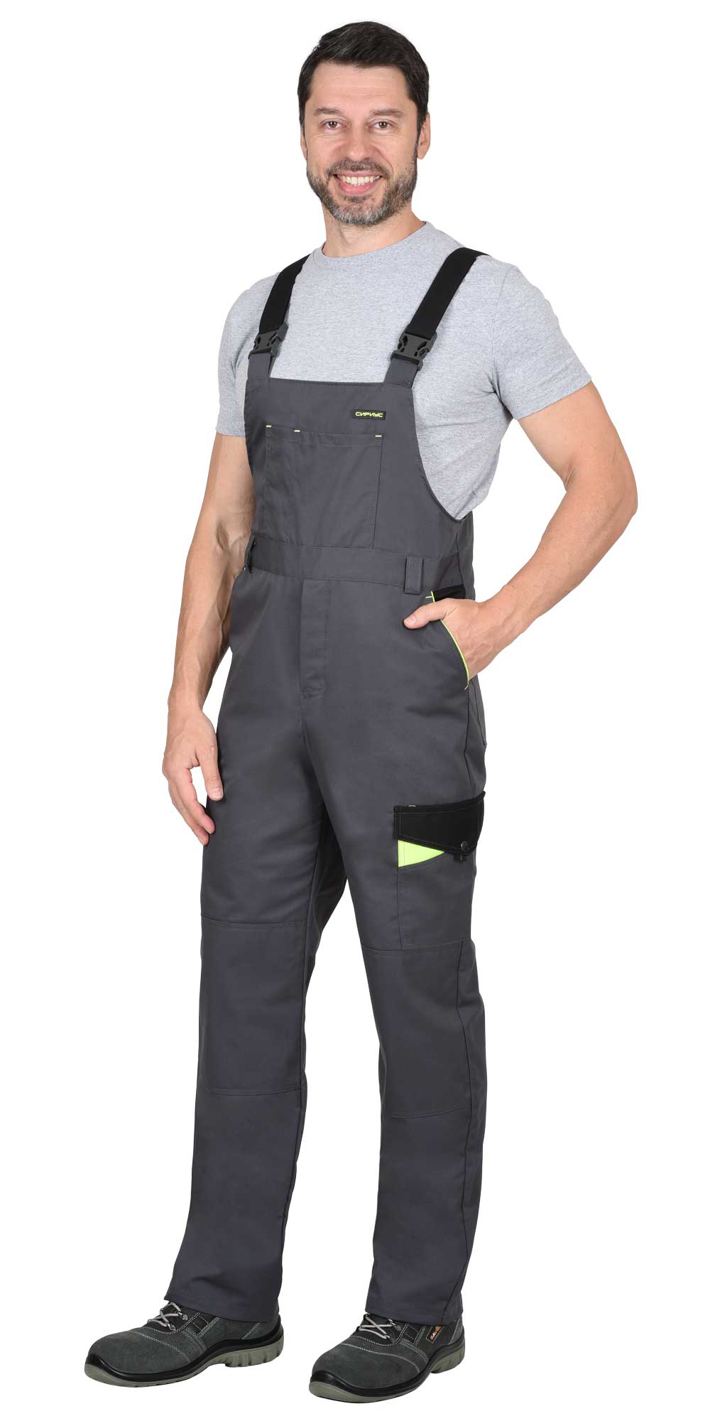 Полукомбинезон с застёжкой гульфика и застёжкой в правом боковом шве на пуговицы; с различными карманами; с наколенниками; по спинке вставлена резинка. ГОСТ 27575-87